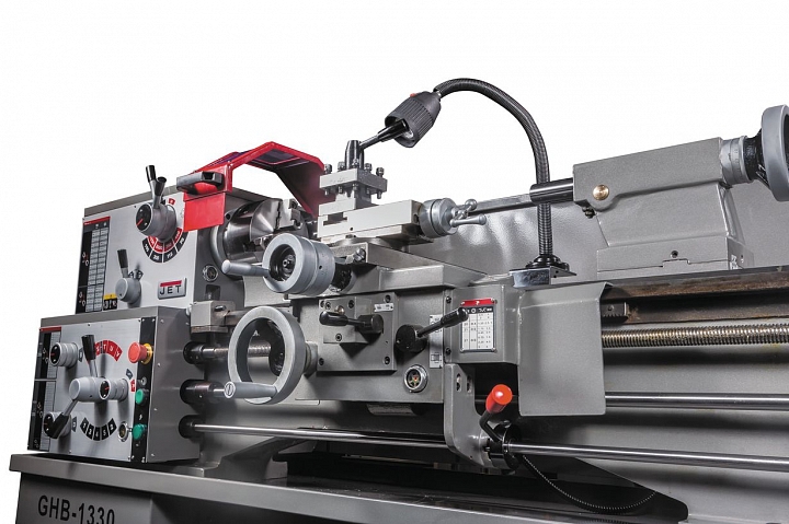 Следуя стандартам качества, компания JET оснащает свои токарные станки, включая и GHB-1330A, закаленными и тщательно отшлифованными направляющими станины, что повышает точность обработки и увеличивает срок службы оборудования. Шестерни передней бабки также закалены и отшлифованы. Их придется менять только лишь при переходе с нарезания метрической резьбы на дюймовую. С целью обеспечения непрерывного охлаждения, снижения уровня шума и увеличения ресурса механизм привода шпинделя помещен в масляную ванну. Станок оснащен механизмом автоматической подачи продольного и поперечного суппорта, а также регулируемой в поперечном направлении задней бабкой для обточки конических заготовок. Как и все станки этой линейки, GHB-1330A построен по двухвинтовой схеме: ходовой винт отвечает за резьбу, ходовой вал, отвечает за точение в автоматическом режиме. Также предусмотрен толчковый режим работы шпинделя для облегчения переключения режимов работы.